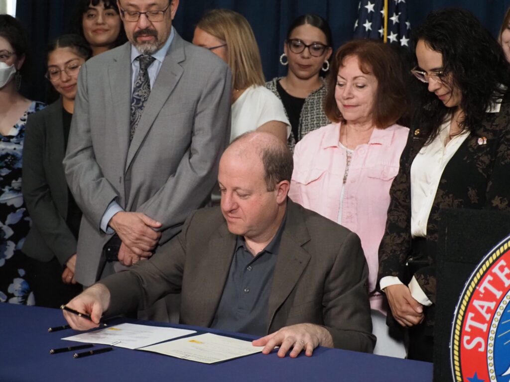 Le gouverneur du Colorado, Jared Polis, signe le projet de loi 25-183 du Sénat le 25 avril 2025 au Capitole du Colorado. © Sara Wilson/Colorado Newsline